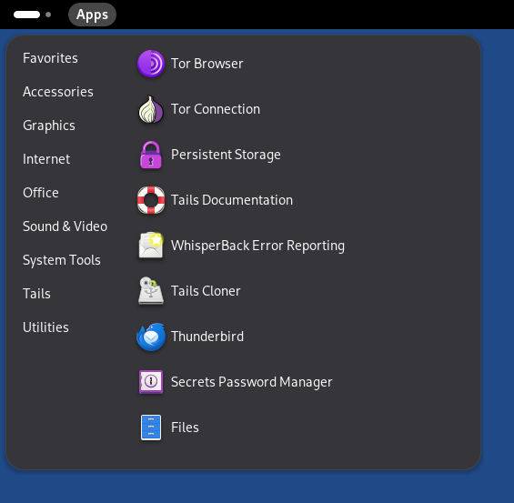 The Apps menu provides launchers for the included software and GNOME utilities.