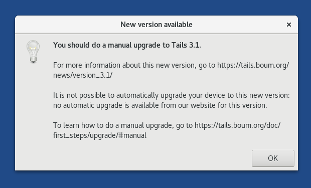 In the About Tails utility, you can click Check for Upgrades to check whether a new version of Tails is available. This check is also done automatically every time you start Tails and connect to the Tor network.